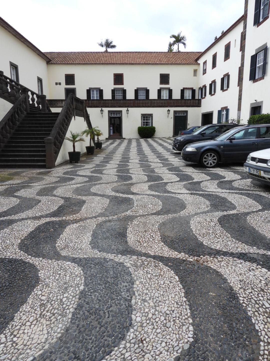 Överst till vänster ser vi en typisk portugisisk specialitet: roligt mönstrade stenbeläggningar på torg och trottoarer. Den vi ser här finns alltså på gården till Militärmuseet i Funchal, entrén är längst in till vänster. Byggnaden har varit del av en befästningsanläggning och markbeläggningen har kanske velat göra en anfallare lite yr i mössan.
