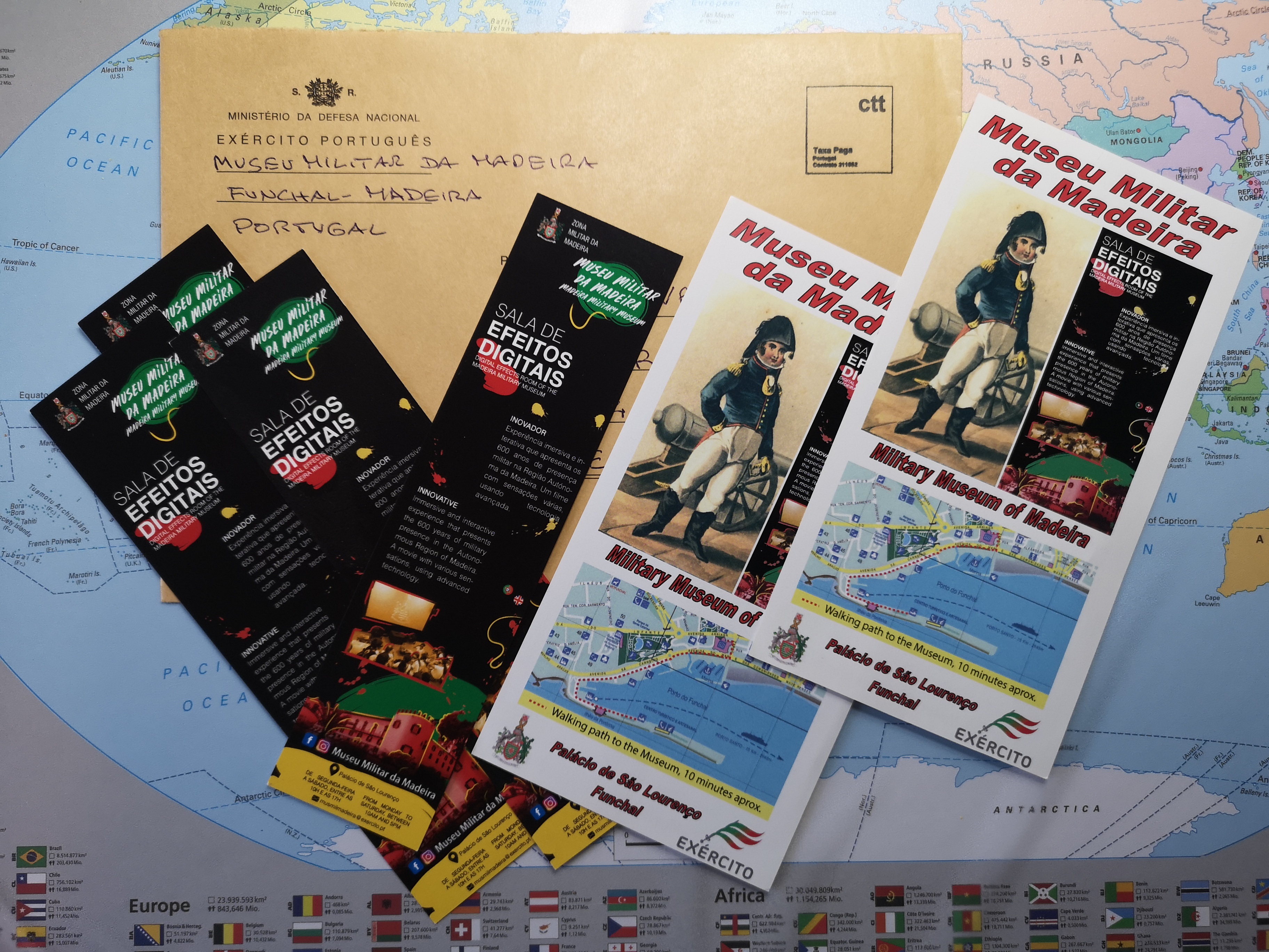 Nu hade jag inga vänner på Madeira. Så då var det ju tacknämligt att det finns fungerande postservice kvar på det här klotet. Så jag skrev och skickade. Och idag, exakt fyra veckor efter att jag postat mitt brev damp det ner ett kuvert från Museo Militar Da Madeira. Det gick alltså fortare att förmedla ett brev till Madeira och sen få ett tillbaka än att enbart få hem postade vykort från Azorerna.