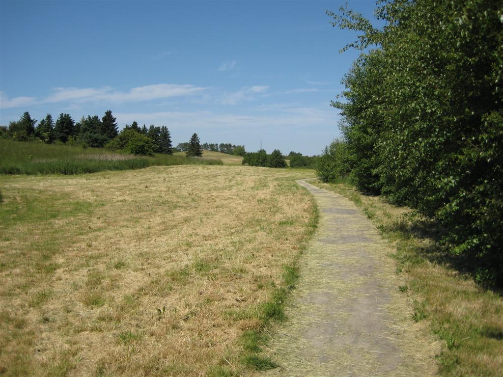 Riktigt hett i dag. Stigen går väster om mossen, uppe till vänster går Husie kyrkoväg och vi är ungefär 25 minuter från Gustav.