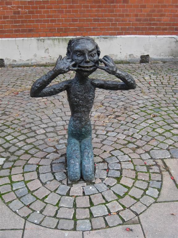 Min bästa utflyktskompis M. (1) och jag tog tåget (2) idag till Pompejiutställningen (3) i Hässleholm. Fin. Vi gick och tittade på roliga skulpturer i kommunen efteråt, (fotot visar Grimaserande flicka av Lena Cronqvist, stenläggning och tegelvägg kompletterar fint) men konstaterade att moment 4 inte gick att uppfylla på orten. Så vi åkte hem till Malmö igen och åt världens godaste macka på fiket inne på centralstationen: jättestor rågbrödbulle med ishockeypucktjock skiva chèvreost, mosad avocado, fikonmarmelad, groddar och lite sallad. En utflykt som hade allt. När vi en annan gång tog tåget runt Öresund och hoppade av på Louisiana åt vi en megastor bit bautagod äpplekaka med nötter och kola i på Hard Rock Café i Köpenhamn efteråt. Jag tycker nog dagens utflykt är i höjd med just den gången, eller vad tycker du M.?