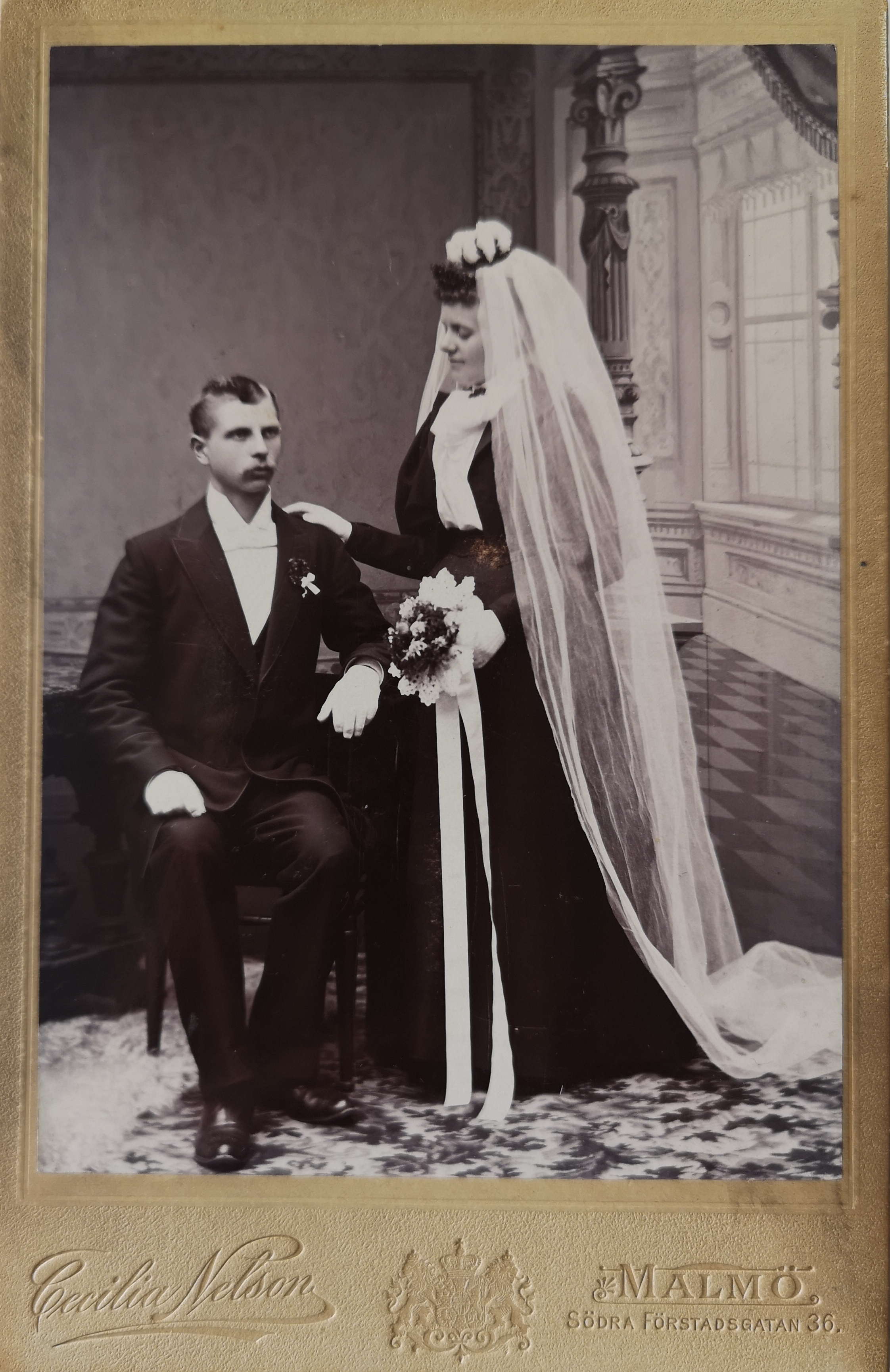 Vill avsluta med det ståtliga bröllopsfotot på morfars far och mor, Jöns och Emma, sedvanligt taget i Cecilia Nelsons ateljé. De gifte sig 1894 och fick leva tillsammans på Monbijougatan till 1933 då Emma dog, 67 år gammal. Änkemannen överlevde henne till 1950 då även han gick bort och det vid en ålder av 84 år.