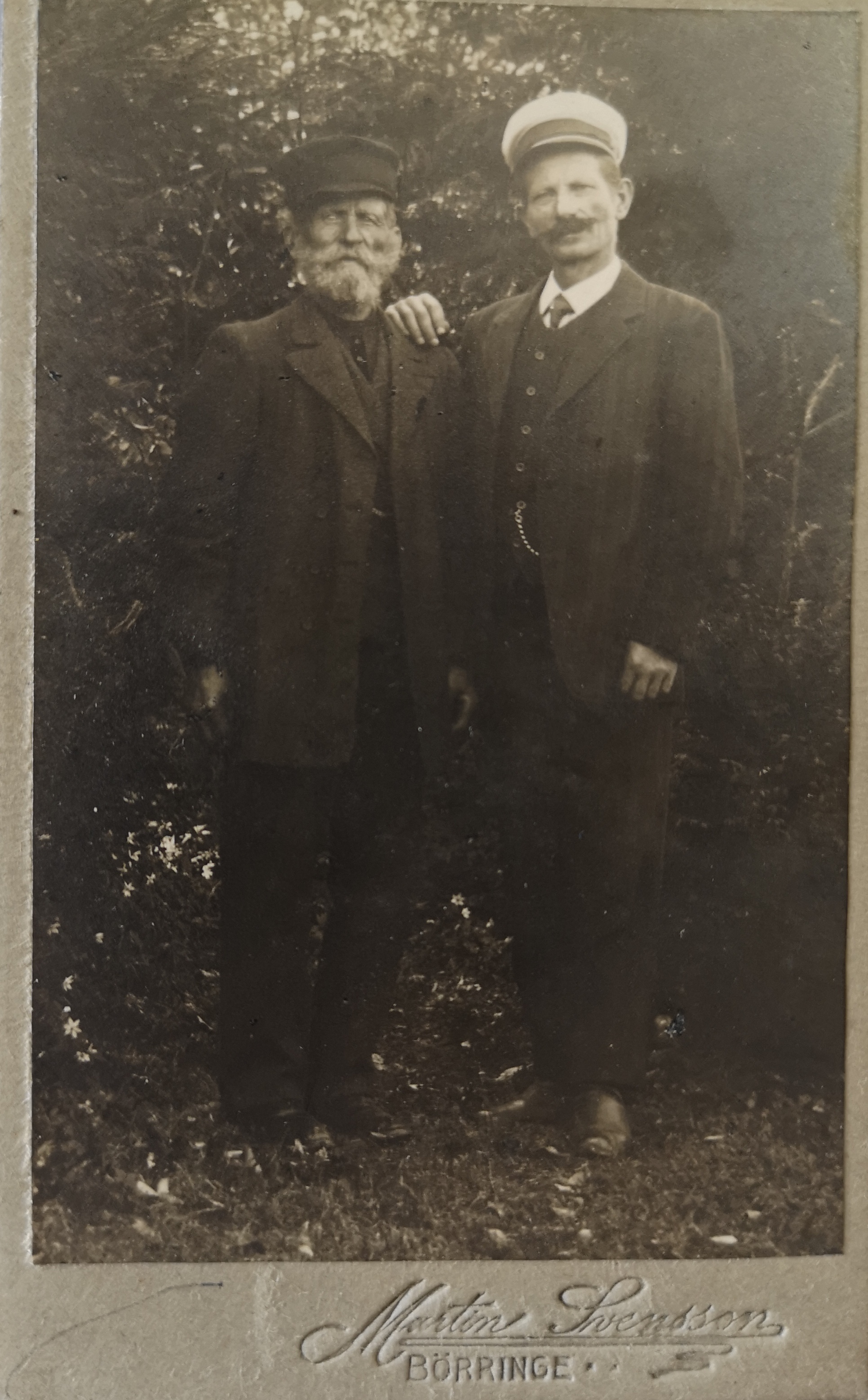 Här ser ni min morfars farfar på äldre dar, Hans Andersson, till vänster i bilden. Hans var född 1840 i Fuglie och kom att under sin levnad bo i Svedala och Västra Kärrstorp. På den senare platsen bodde han med sin familj på gården Marieholm där han var stalldräng. Under åren där, 1866-1869, födde hans hustru –Hanna Jönsdotter, född 1834 i Svedala– två barn: Jöns 1866 och Karna 1869. De fick ett tredje barn, sonen Anders som föddes 1872 i Svedala, denne står till höger på fotot.