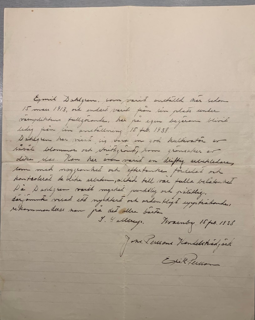 “Emil Dahlgren, som varit anställd här sedan 15 mars 1913 och endast varit från sin plats under värnpliktens fullgörande, har på egen begäran blivit ledig från sin anställning 15 feb.1938.