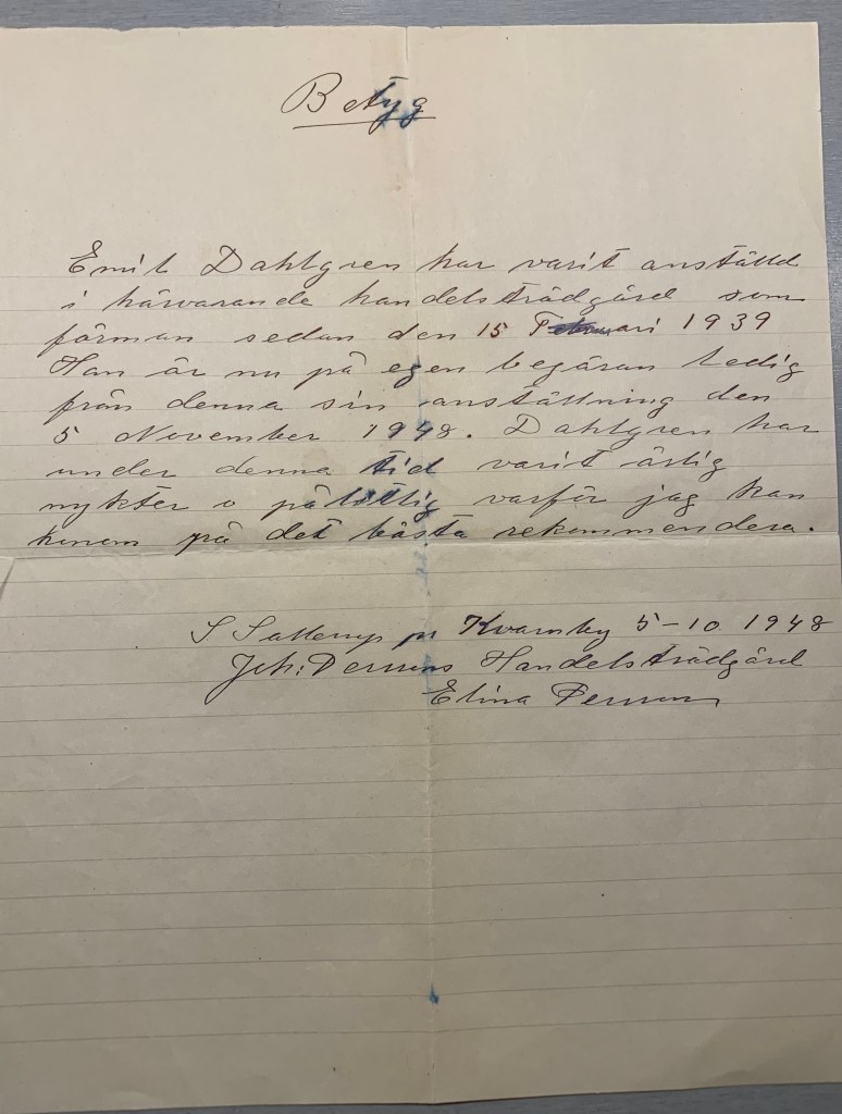 Han är nu på egen begäran ledig från denna sin anställning den 5 November 1948. Dahlgren har under denna tid varit ärlig, nykter och pålitlig varför jag kan honom på det bästa rekommendera.