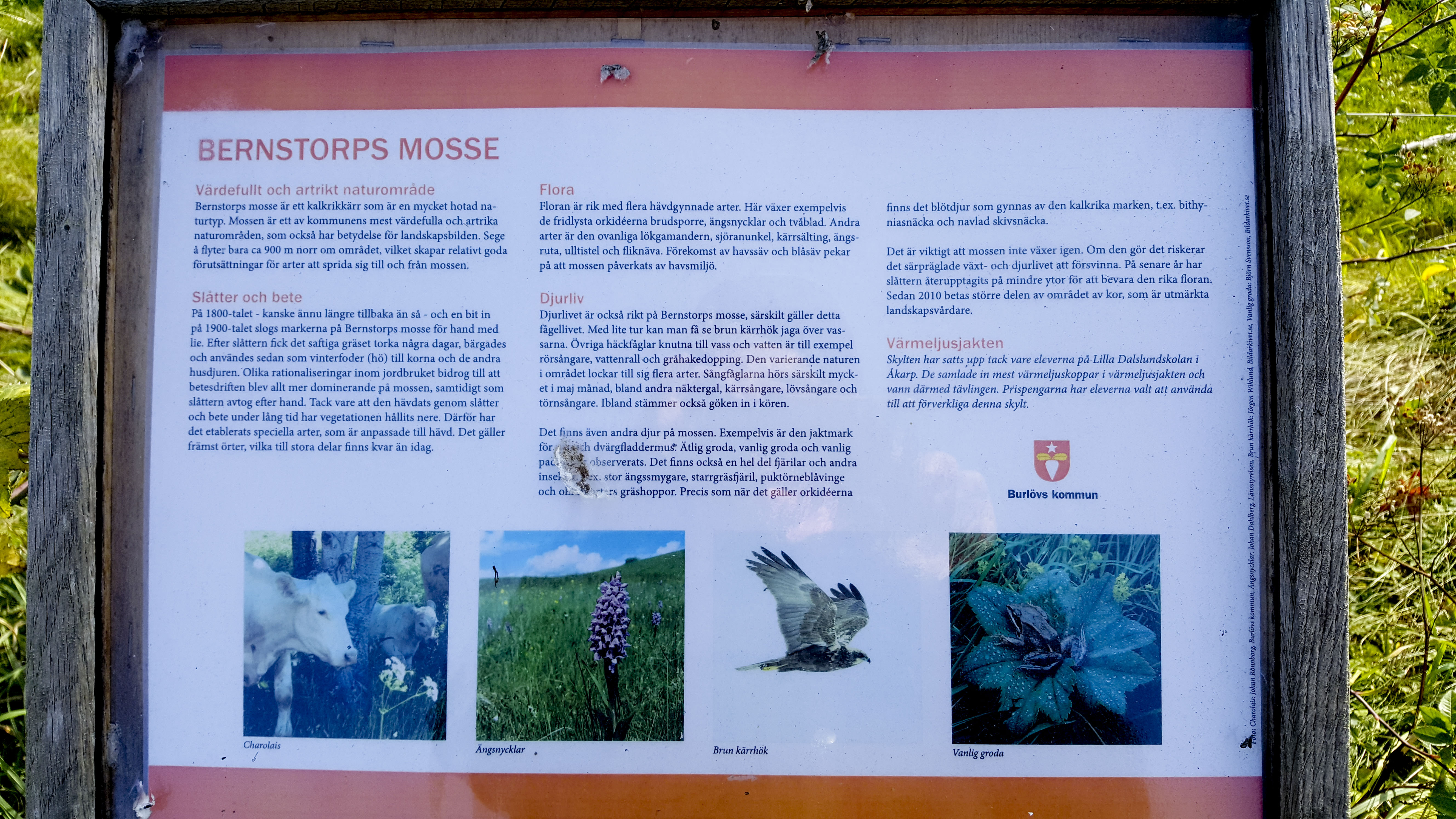 Bakom bussen längs med den diagonal som vägen skapar på fotot finns Bernstorps mosse. Mellan väg 11 och Hornbach är vi så långt österut att det inte längre är Malmö utan Burlöv. Den kommunen berättar stolt om mossen på sin hemsida så jag cyklade dit. Har jag gjort förut men då bara för att fara förbi. Jag har aldrig fattat man kunde ta sig ut i detta unika naturområde. Och att det fanns så mycket där, men nu såg jag en informationsskylt på stigen som går parallellt nedanför bilparkeringen till byggvaruhuset. Klicka på bilden så den förstoras och du kan läsa om orkideer, ätbar groda, dvärgfladdermus och annat märkligt: