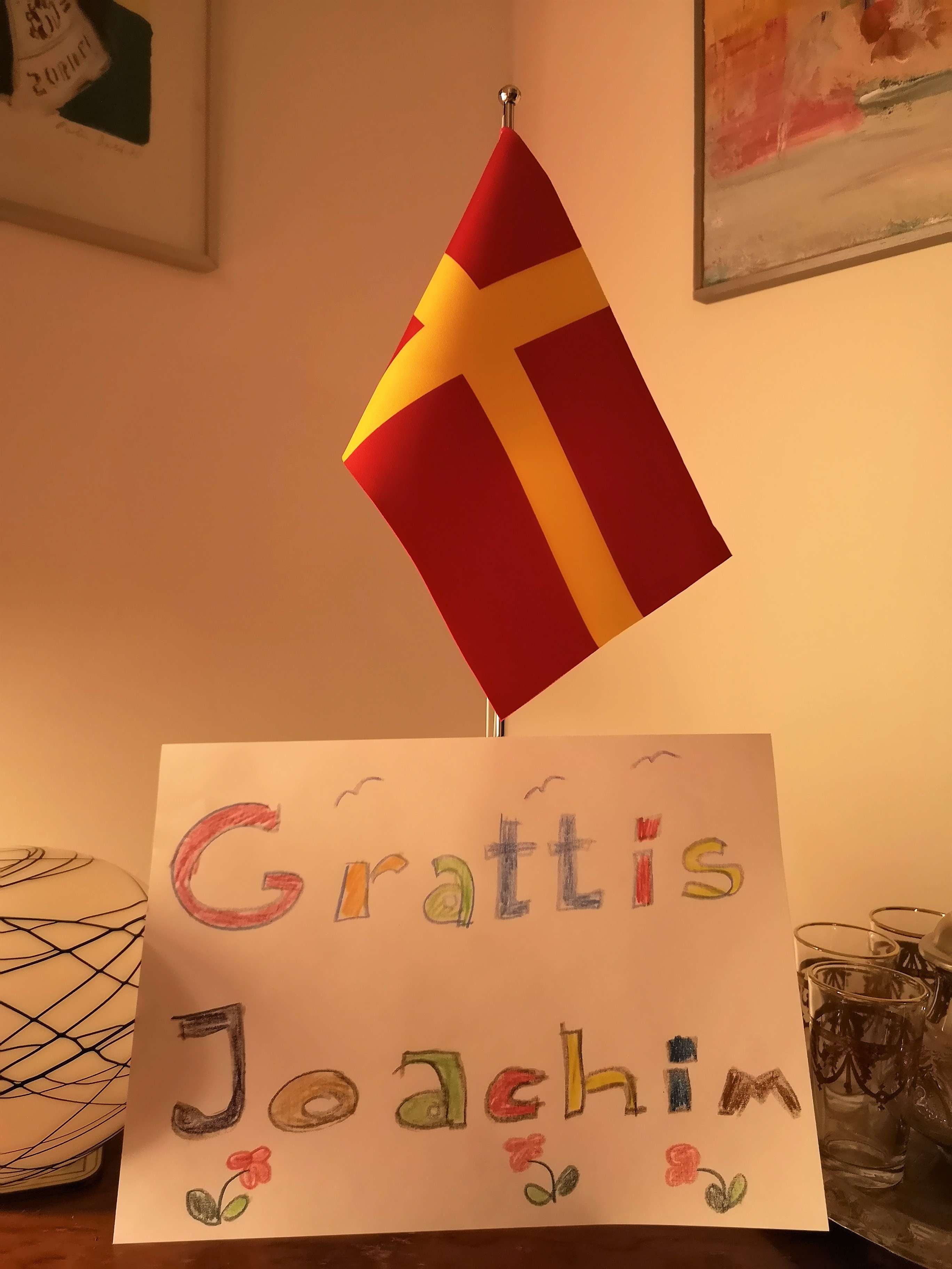 Den skånska flaggan hissar jag och ställer ett handritat födelsedagskort framför när det är läge att fotografera en sådan komposition och skicka till den som fyller år och som jag nämner på kortet. Det gäller då till mina vänner nere i Skåne. Bara som en kul grej när det nu är 60 mil mellan oss.