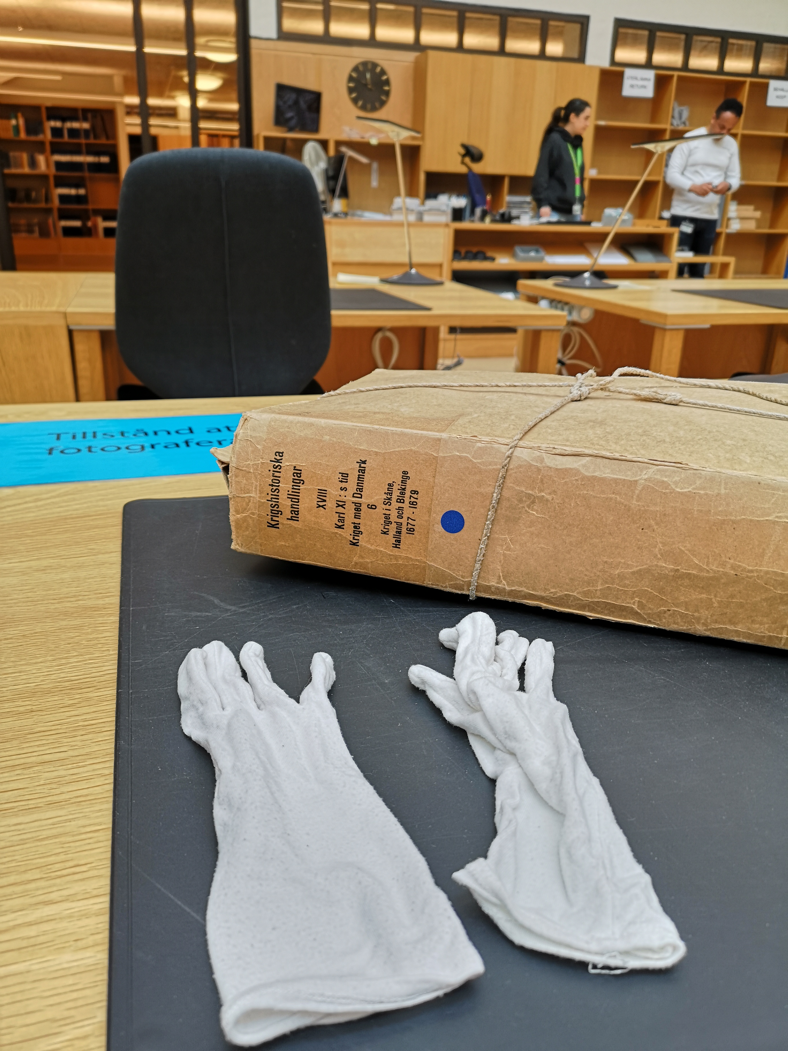 Jag tänkte inte så mycket på det när jag i fjor bedrev själva forskningen, jag var bara så glad ha hittat något att gräva i. Men när jag härom månaden återvände till Krigsarkivet och box 1335 blev jag faktiskt riktigt häpen. Riksarkivet har sommarstängt så handlingarna hade skickats till Krigsarkivet i Arninge dit jag tagit mig för att se om det kanske fanns mer. Arkivlådan har kanske varit i bruk hundra år, vad vet jag, den ser ju åldersstigen ut, se fotot, nött och skavd och ska knytas ihop med ett gammaldags paketsnöre. Kanske hade någon forskare någon gång i disträheten lagt tillbaka ett för mig intressant papper i fel mapp, det fanns kanske mer om Malmö 1677 att kunna skriva om, tänkte jag.