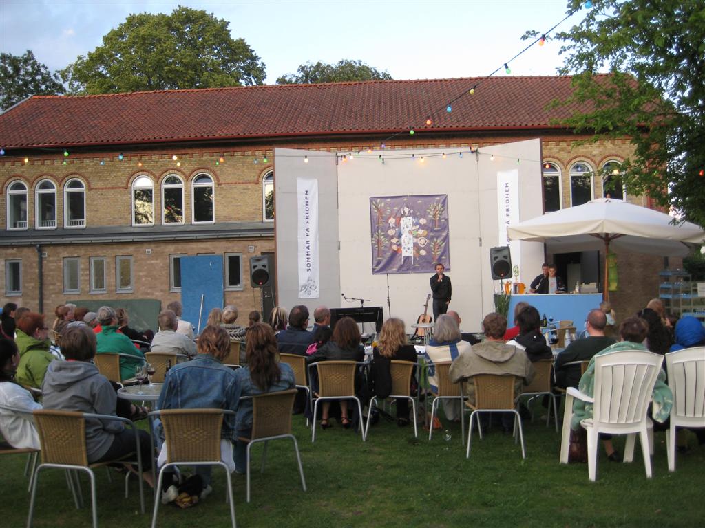 Jag vet inget bättre sätt att tillbringa en sommarvecka på än att gå en kurs på Fridhems Folkhögskola. Utbudet av skapande och utvecklande kurser är rikt och omväxlande. Och blir man inte fullmatad där blir man det av helpensionens utbud av dagliga kulinariska läckerheter. Bara det att det är en vecka utan handla/städa/fixa/dona gör den oerhört rimliga kostnaden än mer värd. Ifall man vill koppla av fullständigt alltså och låta ett annat fokus, en ny känslighet och en större kreativitet ta plats inom en. För det senare räcker inte badstrand och vanlig lättja till för. Testa Fridhem, säger jag bara för jag vet inget bättre! På bilden dansar den orientaliska magdanskursen ringdans med stompkursen, silkscreenstryckarna, de som målade modell med akvarellfärg, skrivarkursen, betongarbetarna och alla andra som gick där den veckan jag var där. Senare på kvällen uppträdde Emil Jensen i det fortsatt vackra vädret. Längtar redan till nästa år!