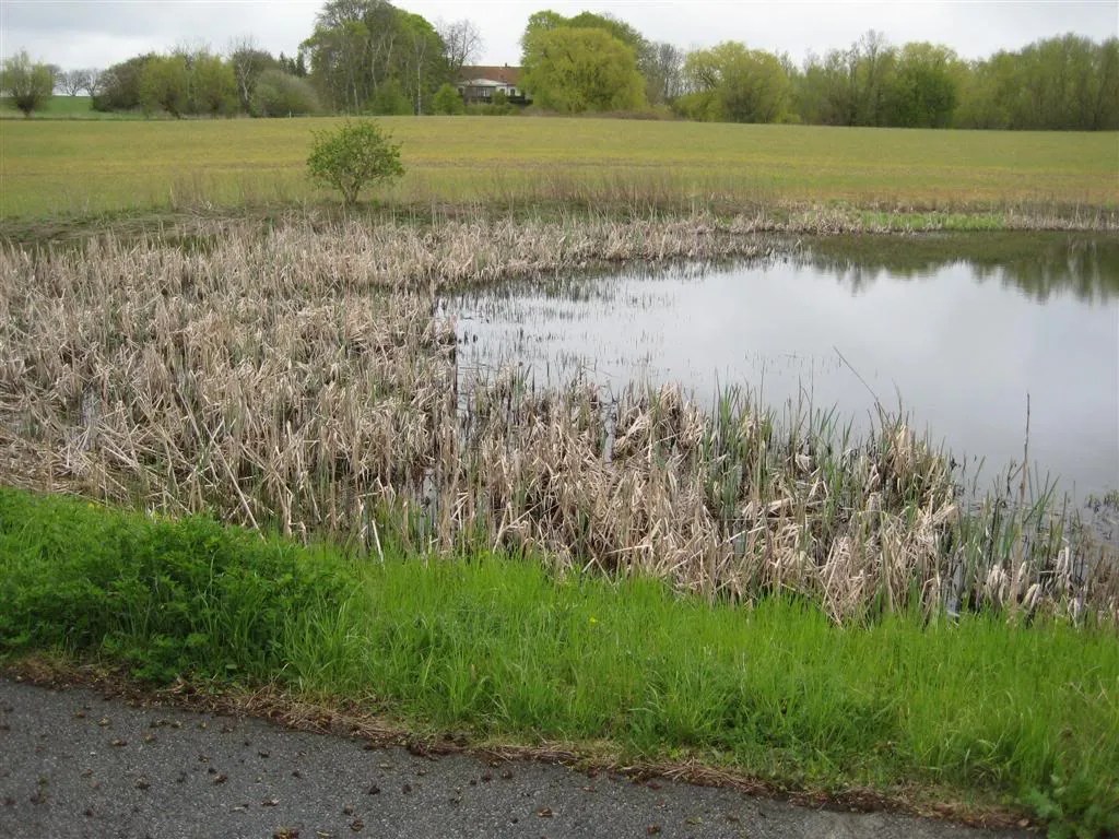 Det här är en favoritvy, vid cykelstigen mot bokskogen. Grundvattenpölen är som ett öga. Där det är vatten idag var det förr ett stickspår till järnvägen. Det användes för att lasta lera, tror jag, som var av ett särskilt slag och som bröts i närheten, om man nu säger så om lera: bryta? När järnvägen lades ner 1948 upphörde driften och vattnet tog över i sänkan.