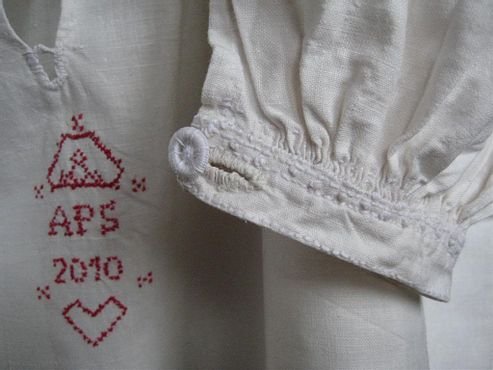 Har sytt en skjorta till min son som dansar folkdans i ett fantastiskt fint lag. Plagget är sytt för hand i lintyg i Torna härads stil. Allt enligt traditionen. Broderiet följer gammal förlaga om initialer för skjortbärare, vederbörandes fars förnamn och så S för son.