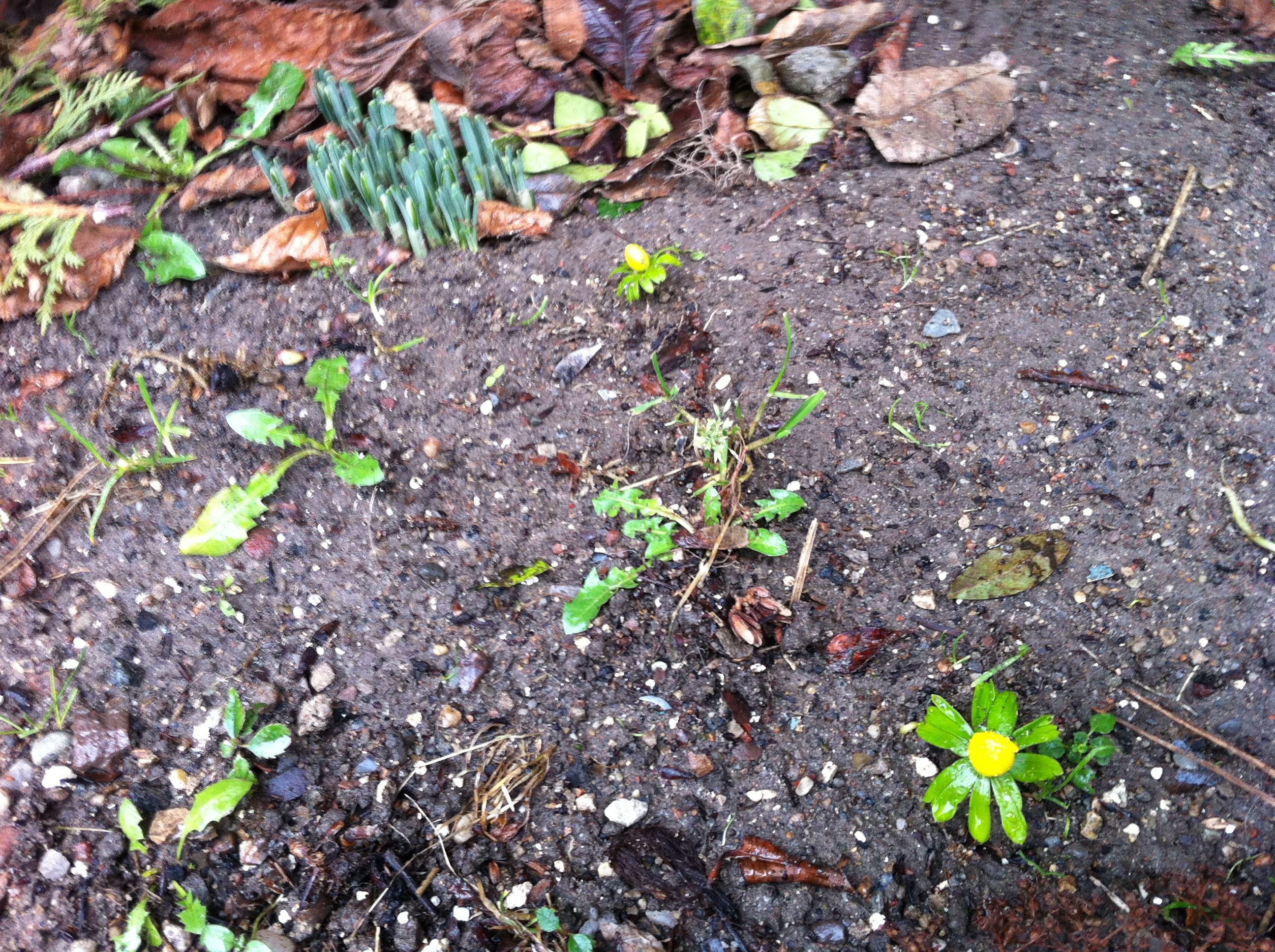Rörig bild, men så verkar den här vintern också vara: först maskrosor och sedan vintergäck. Såg det här landskapet i mikroformat idag lördag 11 januari 2013 och det verkar som om det även här hos vänner i grannskapet tänker sticka upp tidiga maskrosor. Vintergäcken är i varje fall en månad tidig jämfört med andra år jag noterat premiär för förekomsten, kolla taggen vintergäck under bloggtexten. Kanske snödropparna i fonden också blir tidiga. Det ska bli snö, säger dock prognosen och då vet man inte vad som händer under täcket. 🙂 Hellre snö än regn. Och gärna att temperaturen tar sig ner en tid så vi slipper mördarsniglarna i sommar. Sommar… 🙂